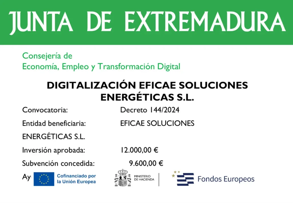 EFICAE Soluciones Energéticas S.L. ha desarrollado un proyecto de digitalización para mejorar su presencia digital y su estrategia de marketing online. La actuación ha reforzado la visibilidad de la empresa y la difusión de sus servicios en eficiencia energética. El proyecto cuenta con una inversión aprobada de 12.000 € y una subvención concedida de 9.600 €. Está cofinanciado por el FEDER en el marco del Programa Extremadura FEDER 2021-2027. La ayuda financiera de la Unión Europea asciende a 8.160 €. La actuación contribuye a la transformación digital y a la mejora de la competitividad empresarial.